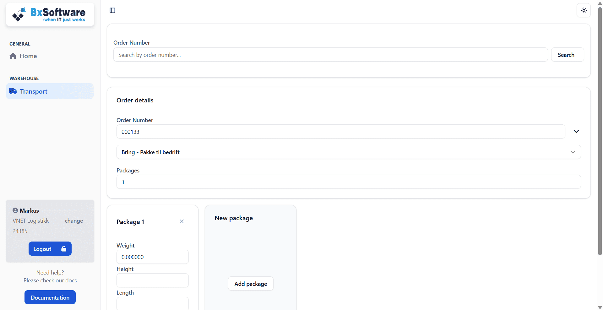 Tast inn eller scan ordrenummer og informasjon om mottaker hentes fra ERP-systemet. Sporings-informasjon og kostnad kan likevel skrives tilbake.